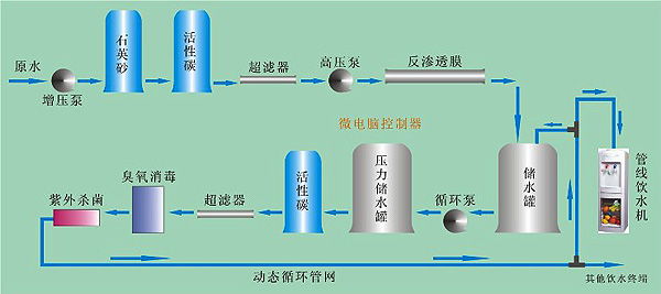 本公司生产楼宇供水设备主要是为多层建筑饮用净水设立供水站,设备有:RO反渗透、超滤、软水系统,净水先送入大型净水池储水罐中,然后通过采用食品级水管管网直接供应到用户点。 供水的净水工艺是对自来水的深度处理,它通过过滤、软化、膜分离、杀菌等方法,去除水中有害重金属、余氯、有机物、细菌及病毒等杂质,使其成为优质的生活用水(或直饮水)。 产品规格:2m3/h~20m3/h 产品工艺流程图: